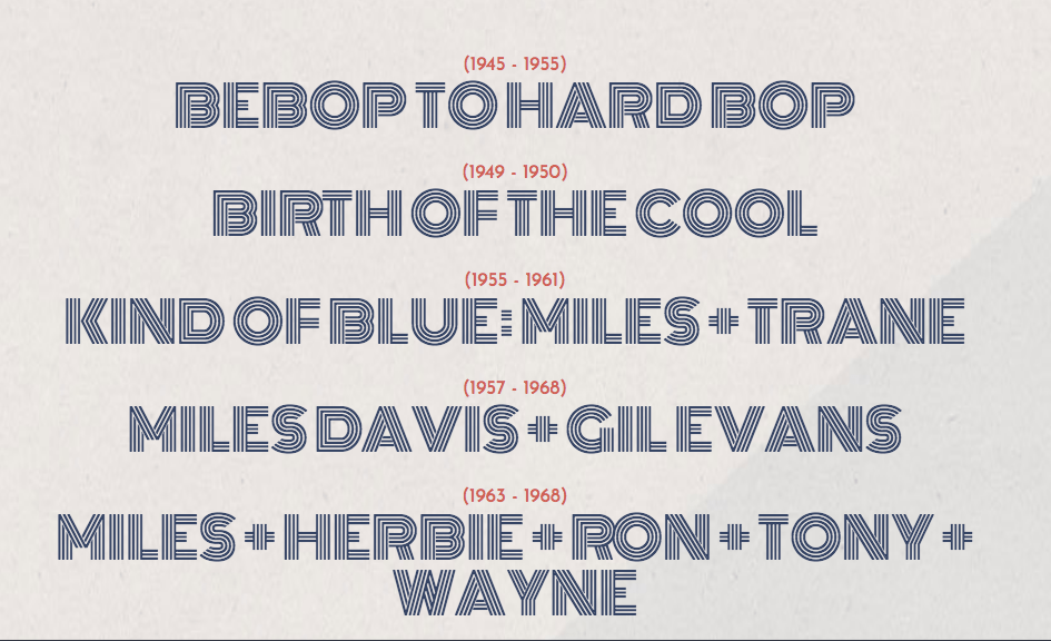 Miles defined so many genres of jazz with his iconic muted trumpet (extra points if you know the type of mute he used). This graphic from the Miles Davis website shows the span of his amazing career and the genres he pioneered: